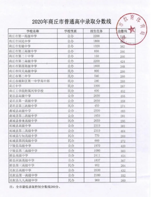商丘市最低录取控制分数线为260分。