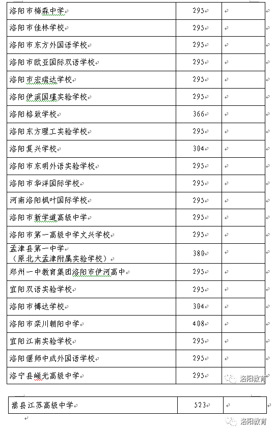 栾川县民办朝阳中学:按照河南省民办高中学校招生政策,面向洛阳市内县外招生160人。面向栾川县招生220人,录取分数线449分。