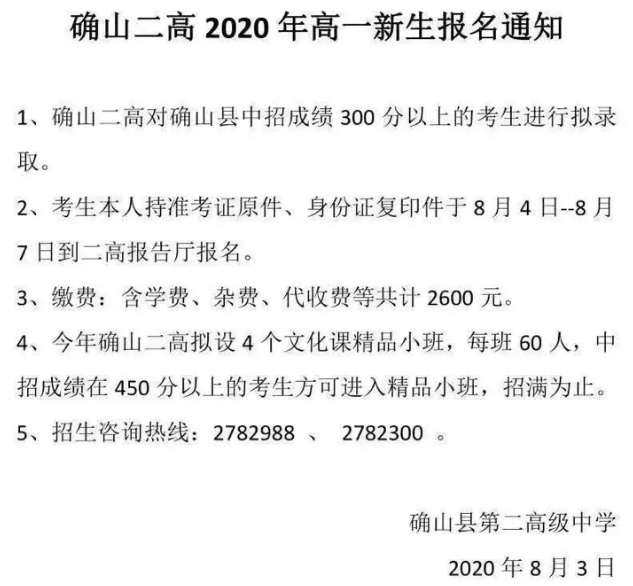 栾川县第二高中:招生70人,录取分数线280分。