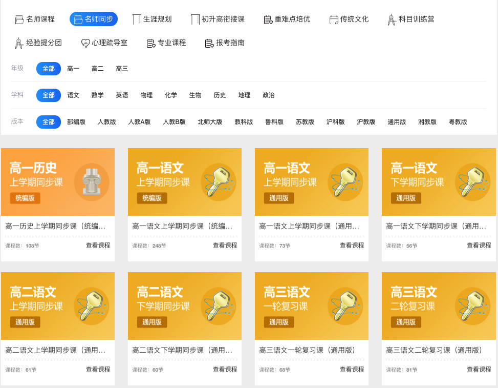 课程视频系列:初、高中全科知识点视频精讲,初、高中全科同步课程讲解,初升高衔接课程,重难点培优课程,科目训练营,传统文化素养课程,心理辅导课程等。